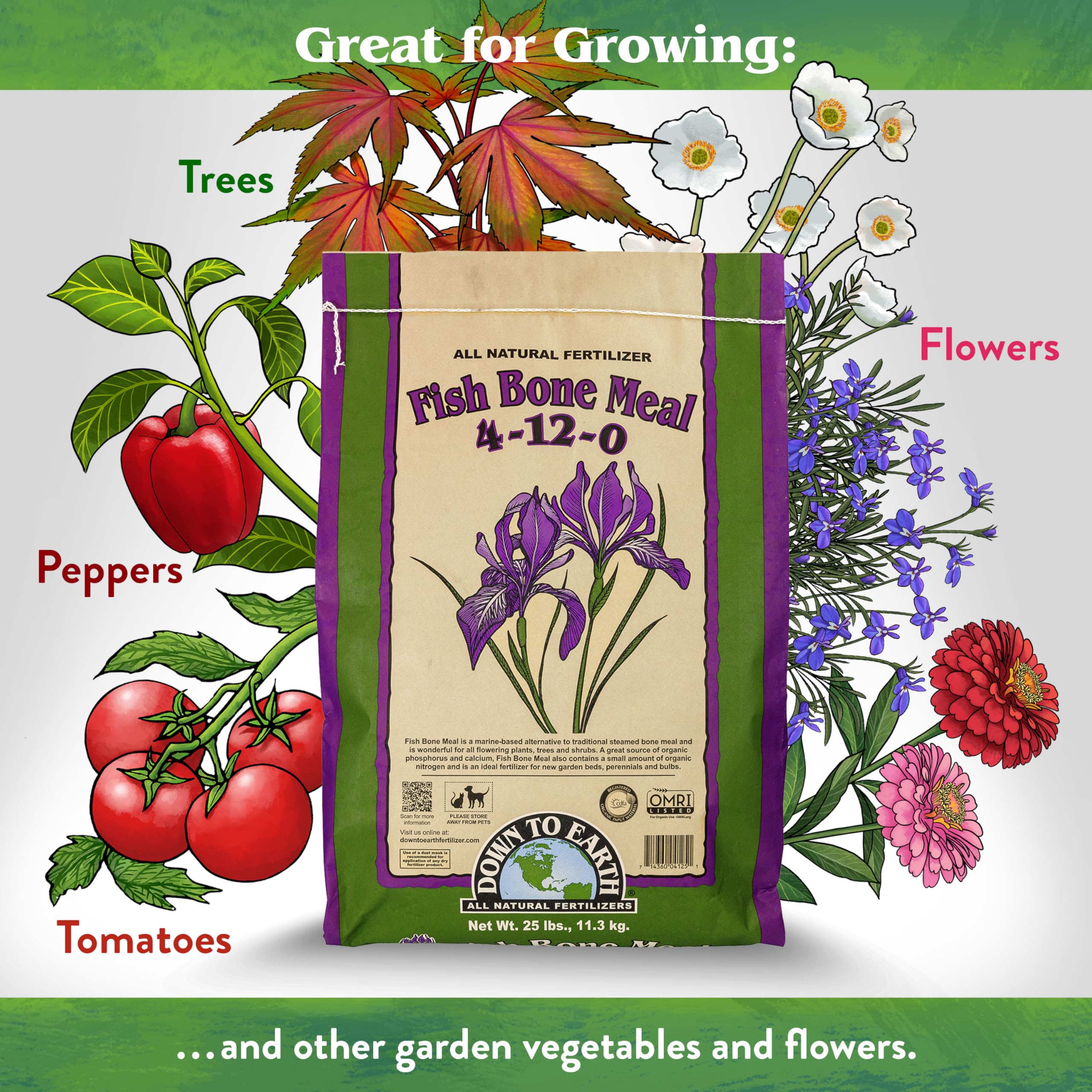 - Down To Earth Fish Bone Meal is a twenty pound bag of all natural fertilizer with 3-16-0 formula and is listed by the Organic Materials Review Institute (OMRI) for use in organic productionDown To Earth Fish Bone Meal is a twenty-five pound bag of all natural fertilizer with 4-12-0 formula and is listed by the Organic Materials Review Institute (OMRI) for use in organic production