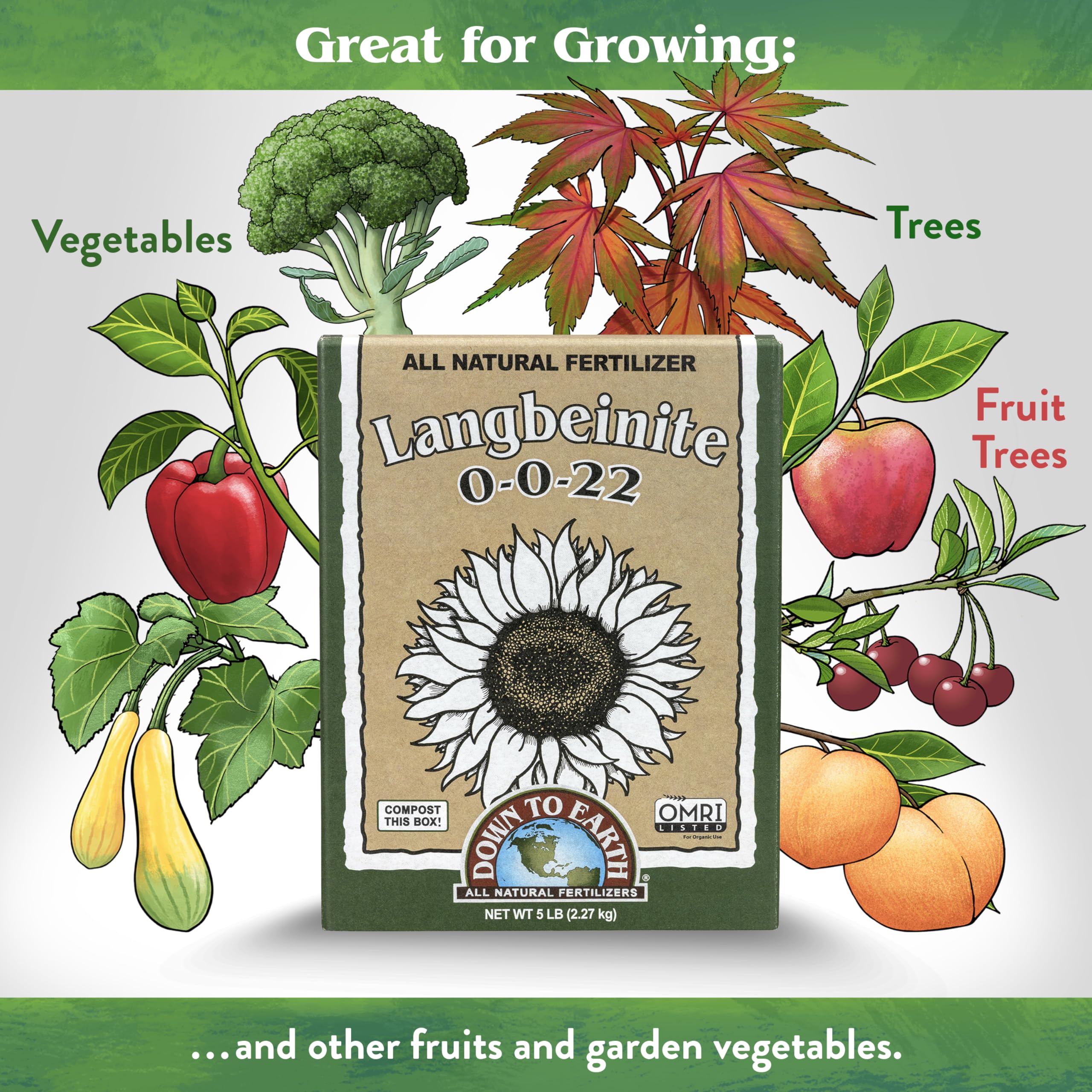 - Down To Earth Langbeinite 0-0-22 is a naturally mined crystalline mineral that supplies the water-soluble sulfate form of three vital plant nutrients: potassium, magnesium and sulfurs