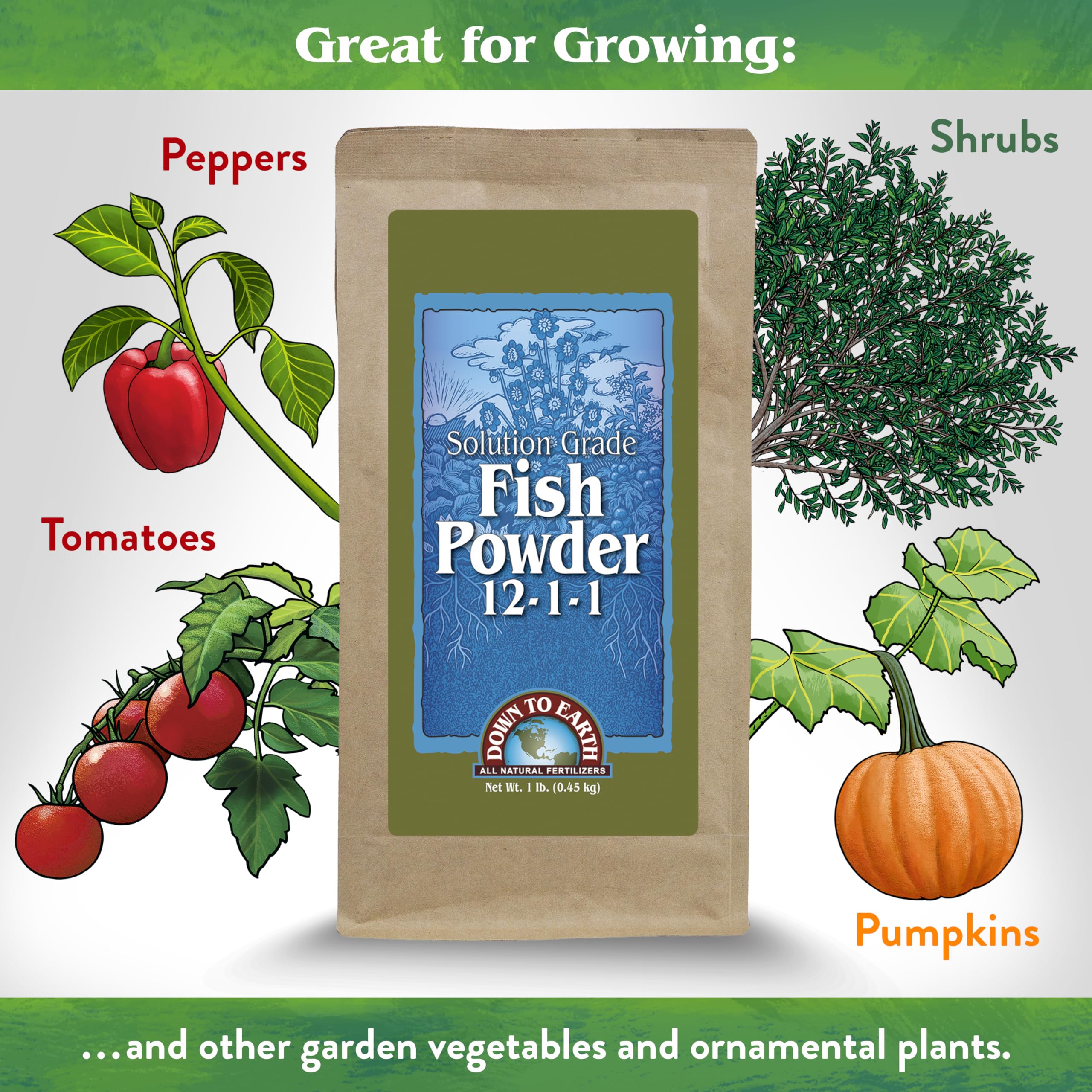 Down To Earth All Natural Fertilizers Organic Solution Grade Fish Powder - Water Soluble Nitrogen - Makes up to 50 Gallons of Liquid Fish Fertilizer for Soil or Foliar Spray 12-1-1, 1 lb