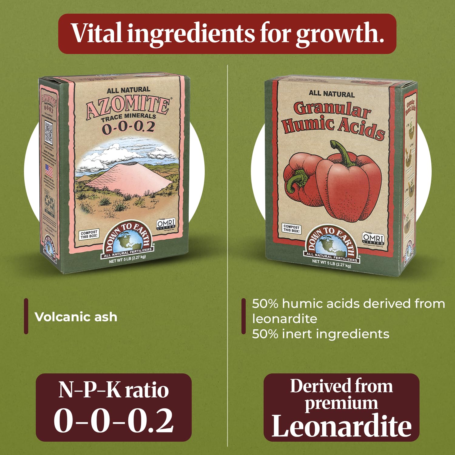 - Complete Soil Nutrition: Remineralize and recharge your soil naturally with the combined power of Down to Earth Azomite Powder and Granular Humic Acids; Together, these OMRI Listed soil amendments deliver over 70 trace minerals and 50% humic acids, promoting healthy microbial activity, improved nutrient uptake, and vibrant plant growth in gardens, lawns, and landscapes