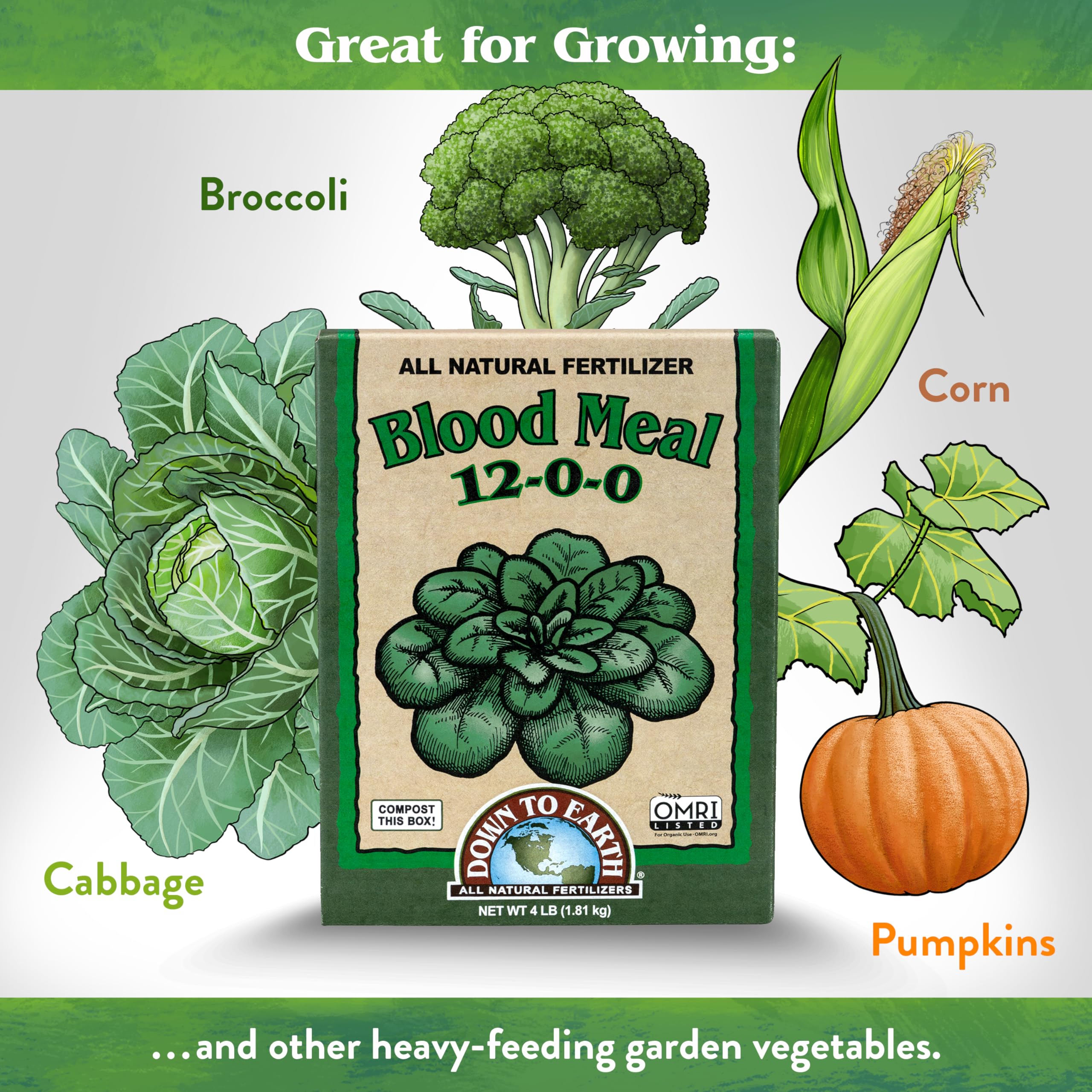 Down To Earth Blood Meal is a five pound box of all natural fertilizer with 12-0-0 formula and is listed by the Organic Materials Review Institute (OMRI) for use in organic production